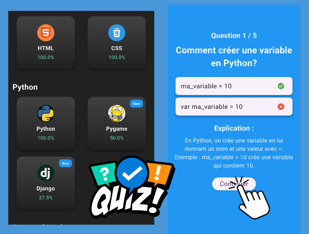 Avec chaque quiz, teste tes connaissances, débloque les solutions détaillées et gagne de l’XP. Plus tu joues, plus tu apprends, plus tu montes en niveau.